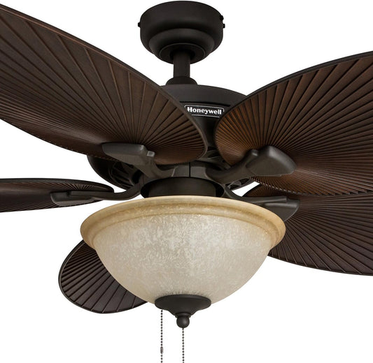 • Ceiling Fans Palm Island 52 Inch Ceiling Fan with Light, Indoor/Outdoor Ceiling Fan with Pull Chain, Tropical LED Dual-Mount 5 Palm Leaf Blade Design, ETL Damp Rated, Bronze (50202-01)